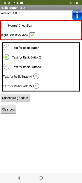 右对齐RadioButton实现: 通过使用无文本的CheckBox,文本通过Label添加。CheckBox和Label都排列在HorizontalArrangement中。
