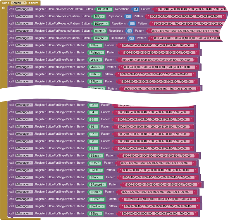 Button组件注册为带重复的自动数据包传输。Button.TouchDown运行指定Pattern和AltPattern的RepeatedAlternateTransmit方法。在Button.TouchUp时执行StopTransmission。