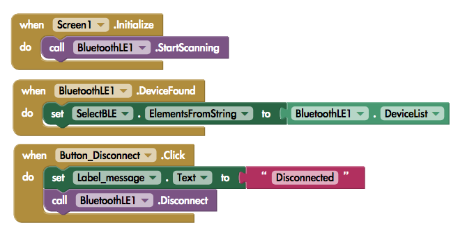 程式初始化时,先扫描附近的蓝牙设备,并把扫描到的设备放到 SelectBLE 这个 ListPicker 里面。断线时直接调用 BluetoothLE.Disconnect 指令。