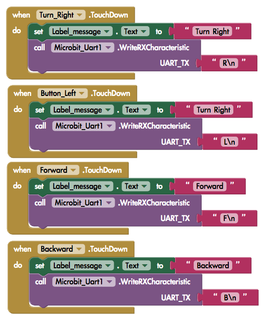 使用四个按钮的 TouchDown 事件来发送不同的指令给 micro:bit,使用 WriteRXCharacteristic 指令来发送 “R\n” 这样的字符串,R 是根据不同按钮的控制指令,\n 是换行符号,代表一个命令的结尾。