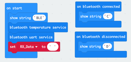 micro:bit 在启动时会显示 “BLE” 訊息提示使用者,并执行蓝牙温度服务与 UART 服务。宣告一个文字变量 RX_Data 来接收从手机发送过来的蓝牙訊息。