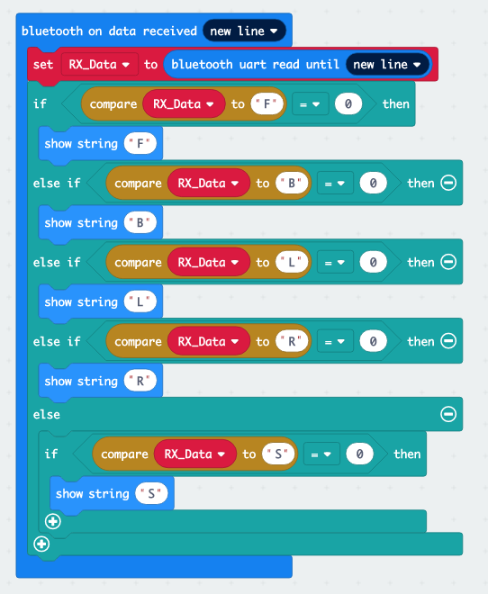 等待是否收到新的蓝牙信号,以换行符号 (newLine) 作区别,并把读取结果放在 RX_Data 变量中。比较变量内容并执行对应动作。如果您想要控制机器人的话,只需要在各个 case 中放入对应的马达控制指令即可。
